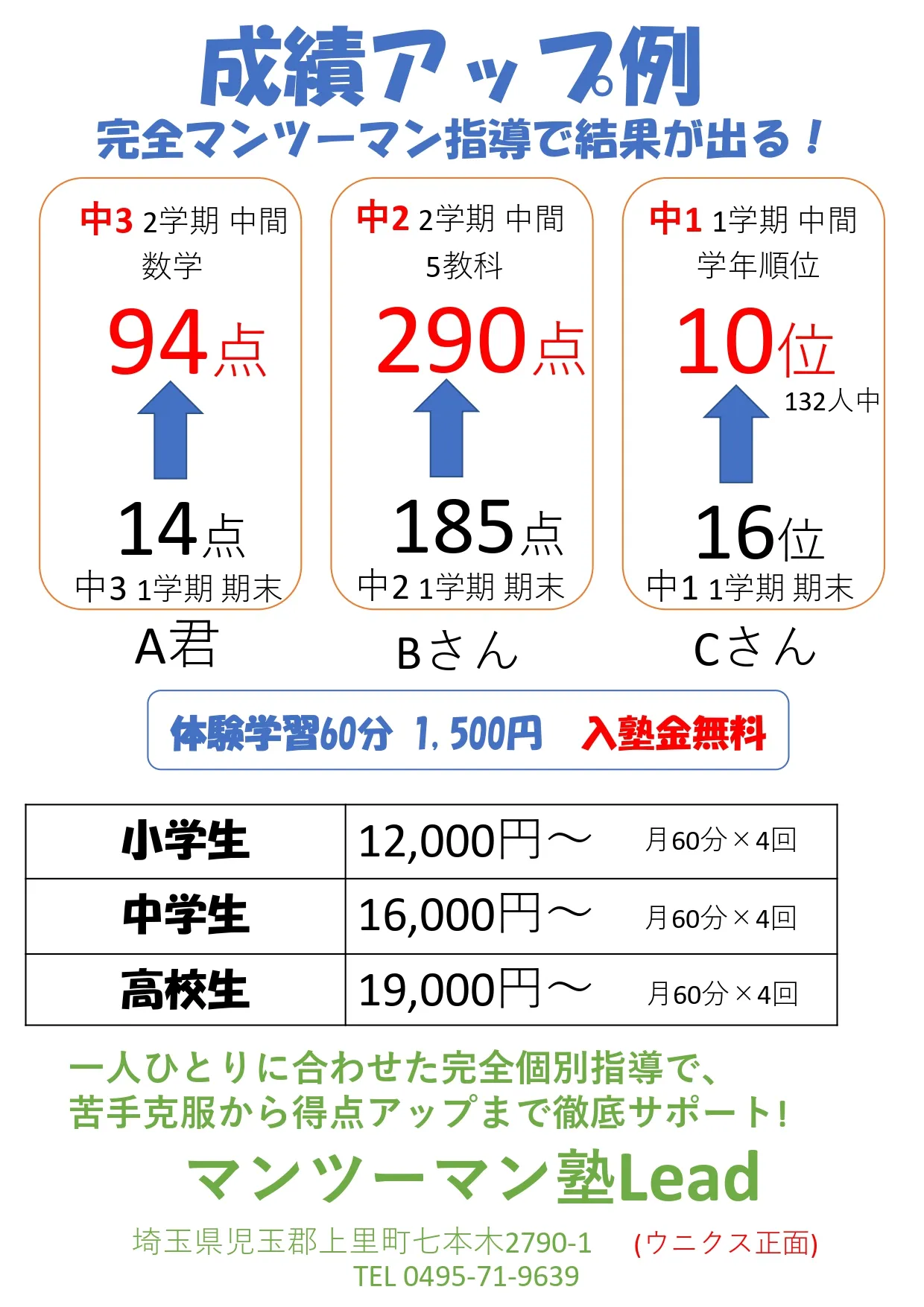 A. マンツーマン専門塾Leadは完全1対1個別指導ですから、そのときに必要な勉強をお子さまのペースで学習することができます。分からないまま先に進んでしまうようなことがありません。また、つまずいているような所があれば、遡って復習します。例えば、数学の二次方程式が苦手なお子様は、平方根や因数分解の復習から始める事も出来ますし、一次方程式や連立方程式などピンポイントで方程式の復習をする事も可能です。つまづいている所を解決する事で、苦手意識を持っていた科目の成績がアップして、むしろ得意科目に変わっていくこともあります。